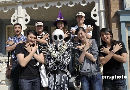 十月十日,中國女子排球隊(duì)成員到訪香港迪斯尼樂園。期間嘉賓把握機(jī)會(huì),跟喜愛的迪斯尼朋友合照。中新社發(fā) 鐘新 攝