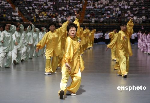 由臺灣太極拳總會、臺北市政府等共同主辦的太極拳錦標(biāo)賽,十月十八日在臺北市體育館(臺北小巨蛋)開賽,來自臺灣部分縣市及臺灣以外地區(qū)的千余名太極拳愛好者參賽。中新社發(fā) 楊旭 攝