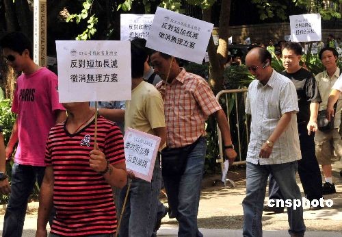 十月二十八日,香港逾百名的士司機(jī)到立法會(huì)外請(qǐng)?jiān),要求撤銷“短加長(zhǎng)減”方案。方案將市區(qū)的士起價(jià)由十六元加至十八元,而乘搭的士長(zhǎng)途車,則只需支付現(xiàn)時(shí)約八折的車資。中新社發(fā) 譚達(dá)明 攝