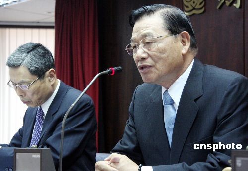 11月1日下午,海基會(huì)在臺(tái)北舉行記者會(huì),公布海協(xié)會(huì)會(huì)長(zhǎng)陳云林5天訪臺(tái)行程,并披露兩會(huì)參加協(xié)商代表團(tuán)名單。經(jīng)海協(xié)會(huì)先遣人員與;鶗(huì)方面的最后確認(rèn),陳云林率74人的海協(xié)會(huì)代表團(tuán)將于11月3日從北京乘包機(jī)飛抵桃園機(jī)場(chǎng),而廣受矚目的今年兩會(huì)第二次“陳江會(huì)”將于11月4日舉行,并簽署協(xié)議。圖為;鶗(huì)董事長(zhǎng)江丙坤和副董事長(zhǎng)高孔廉在會(huì)上回答記者提問(wèn)。中新社發(fā) 黃少華 攝
