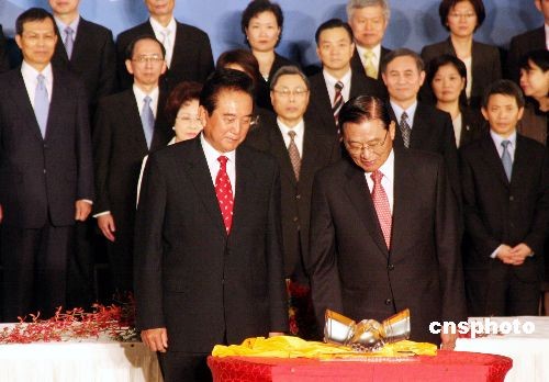 11月4日下午,海協(xié)會(huì)會(huì)長(zhǎng)陳云林和;鶗(huì)董事長(zhǎng)江丙坤簽署有關(guān)兩岸空運(yùn)直航、海運(yùn)直航、郵政、食品安全的4項(xiàng)協(xié)議。圖為協(xié)議文本簽署后,陳云林向江丙坤致贈(zèng)水晶作品《握手》。中新社發(fā) 黃少華 攝