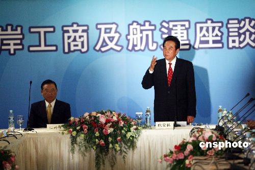 十一月五日上午,兩岸工商及航運(yùn)座談會(huì)在臺(tái)北圓山飯店舉行。海協(xié)會(huì)會(huì)長陳云林、;鶗(huì)董事長江丙坤一同出席座談會(huì)。中新社發(fā) 洪少葵 攝