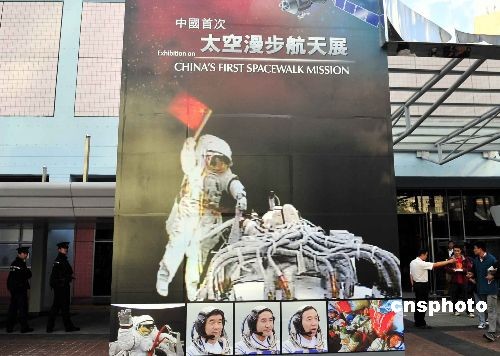 “中國首次太空漫步航天展”將于十二月六至十五日在香港科學(xué)館舉行。展覽將介紹中國載人航天工程,以及今年順利完成出艙任務(wù)的神舟七號宇宙飛船及航天員;主要展品則包括神舟七號宇宙飛船的返回艙、航天服、航天員出艙后所展示的國旗,以及近百幀珍貴的相關(guān)圖片。圖為巨幅宣傳海報(bào)在科技館門前展示。中新社發(fā) 譚達(dá)明 攝