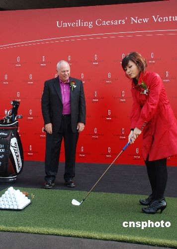 美國哈樂斯娛樂公司十二月十六日在澳門公布“凱撒高爾夫”發(fā)展計(jì)劃,包括開設(shè)亞洲首間布奇哈蒙高爾夫?qū)W校以及對現(xiàn)有高爾夫球場的提升改造。圖為著名高爾夫球教練布奇·哈蒙指導(dǎo)“澳門小姐”呂蓉茵揮桿動(dòng)作。中新社發(fā) 畢永光 攝