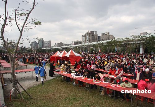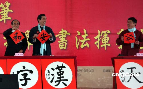 臺(tái)北市政府主辦的第五屆“漢字文化節(jié)”于二〇〇九年的第一天在臺(tái)北中央藝文公園舉行,吸引了一萬二千多民眾共揮毫迎新年。圖為臺(tái)灣地區(qū)領(lǐng)導(dǎo)人馬英九,臺(tái)灣立法機(jī)構(gòu)負(fù)責(zé)人王金平和臺(tái)北市長郝龍斌等各界人士共同揮毫為新年祈福。中新社發(fā) 路梅 攝