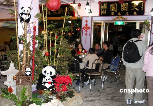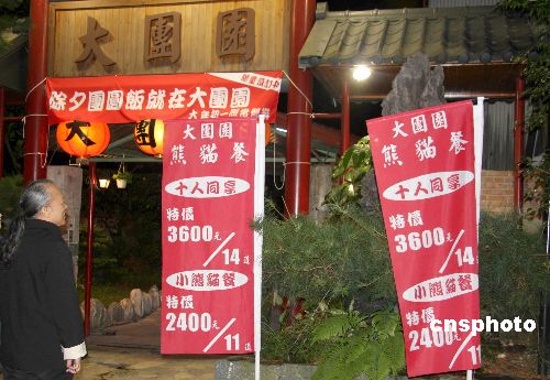 隨著大陸贈臺大熊貓團團、圓圓已經來臺,臺灣臺北縣深坑鄉(xiāng)出現(xiàn)一家“大團圓”飯店。元旦期間,該店別出心裁推出的“熊貓餐”吸引顧客。中新社發(fā) 陳立宇 攝