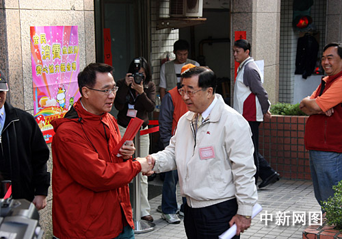 1月18日上午,備受全臺和外界關(guān)注的消費券開始在臺灣各發(fā)放所發(fā)放。圖為臺灣內(nèi)政部門主管消費券發(fā)放的負責人廖了以(右一)今天上午到消費券發(fā)放所督導(dǎo)。鼓勵臺灣民眾善用消費券,積極促進內(nèi)需,擴大消費。陳立宇 攝
