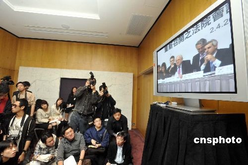 二月四日,電訊盈科在香港會(huì)議展覽中心舉行股東特別大會(huì)表決私有化議案。圖為媒體只能在會(huì)場(chǎng)外一個(gè)房間透過(guò)大會(huì)安排電視轉(zhuǎn)播關(guān)注場(chǎng)內(nèi)會(huì)議情況。中新社發(fā) 鄧慶樂(lè) 攝