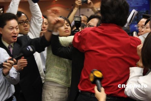 四月二十二日上午,臺(tái)灣“立法院內(nèi)政委員會(huì)”邀請(qǐng)“陸委會(huì)”主委賴(lài)幸媛、海基會(huì)秘書(shū)長(zhǎng)高孔廉等人報(bào)告即將舉行的第三次“陳江會(huì)談”。據(jù)臺(tái)灣中央社報(bào)道:中國(guó)國(guó)民黨籍“立委”李慶華在進(jìn)行程序發(fā)言時(shí),民進(jìn)黨籍“立委”邱議瑩在臺(tái)下表達(dá)不滿意見(jiàn),引發(fā)李慶華不滿,要邱議瑩“有點(diǎn)家教”,邱議瑩(左四穿白衣女性)與李慶華(穿紅衣男性)爆發(fā)口角,并突然從后面打李慶華一巴掌。李慶華下午到臺(tái)北地檢署,按鈴控告邱議瑩傷害及公然侮辱罪。圖為本社記者在“立法院”采訪時(shí)拍攝到的情景。中新社發(fā) 耿軍 攝