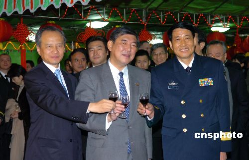 11月30日晚,正在日本進(jìn)行正式友好訪(fǎng)問(wèn)的中國(guó)海軍導(dǎo)彈驅(qū)逐艦“深圳號(hào)”在甲板舉行招待會(huì),日本防務(wù)大臣石破茂、海軍司令吉川榮治,中國(guó)駐日大使崔天凱、公使孔鉉佑、武官徐京明等出席,日本107護(hù)衛(wèi)艦官兵代表及各國(guó)駐日武官三百多人參加。圖為崔天凱大使(左)、石破茂防務(wù)大臣(中)和中國(guó)海軍軍艦訪(fǎng)日?qǐng)F(tuán)指揮員、南海艦隊(duì)副司令肖海洋少將,共同舉杯祝愿中日兩國(guó)世代友好。中新社發(fā) 滕劍峰 攝