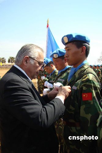2月7日,聯(lián)合國駐蘇丹特派團(tuán)(聯(lián)蘇團(tuán))在中國的傳統(tǒng)節(jié)日--春節(jié)這一天舉行隆重的授勛儀式,破例提前兩個月為中國赴蘇丹瓦烏435名維和官兵授予聯(lián)合國“和平榮譽勛章”,以表彰他們在執(zhí)行任務(wù)時的卓越表現(xiàn)。聯(lián)合國秘書長駐蘇丹特別代表卡齊先生、聯(lián)蘇團(tuán)總司令里德爾中將從首都喀土穆趕來親自為維和官兵授勛并與官兵一起歡度春節(jié)。中新社發(fā) 甄玉改 攝