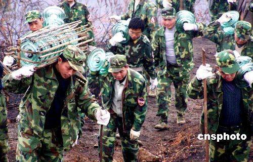 2月19日,預(yù)備役戰(zhàn)士為賀州市海拔1000多米的電網(wǎng)搶修工地運(yùn)送“懸式玻璃絕緣子”。2月17日,廣西軍區(qū)組織部隊(duì)民兵預(yù)備役1100人奔赴賀州市,參加廣西電網(wǎng)遭受冰災(zāi)損失最嚴(yán)重、修復(fù)工程量最大的“萬(wàn)道線(xiàn)220千伏”電網(wǎng)搶修大決戰(zhàn)。戰(zhàn)士們開(kāi)山路、頂風(fēng)雨、踏泥濘,采用肩扛背馱的方式,僅用3天時(shí)間就將300多噸的電網(wǎng)搶修物資全部安全運(yùn)送到海拔400--1000多米、長(zhǎng)30公里的高山工地上,為全面修復(fù)賀州電網(wǎng)贏(yíng)得了時(shí)間。中新社發(fā) 喻湘泉 攝
