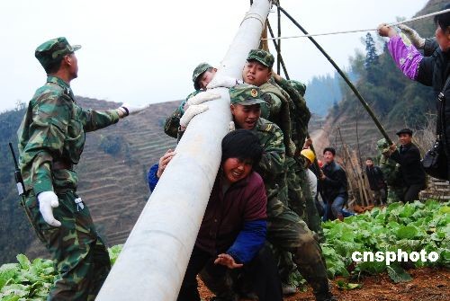 圖:中國(guó)廣西駐軍幫助冰凍災(zāi)區(qū)搶修電力設(shè)備
