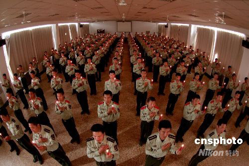 5月14日,武警河北總隊(duì)石家莊市支隊(duì)機(jī)動(dòng)大隊(duì)的官兵們,點(diǎn)燃手中的蠟燭,唱響“祝你平安”、“讓世界充滿(mǎn)愛(ài)”等歌曲,為在四川汶川等地地震災(zāi)害中受災(zāi)的同胞祈福。中新社發(fā) 余洪恩 攝
