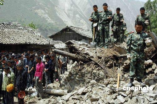 5月19日下午2點(diǎn)28分,武警汶川搶險(xiǎn)救災(zāi)官兵在救援現(xiàn)場向地震死難者默哀。中新社發(fā) 陳文 攝