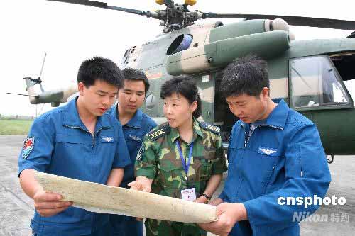 5月25日上午,空軍航空兵某部副師長、特級女飛行員程曉健與飛行員研究穿越高山峽谷執(zhí)行空投任務的航路。作為這次空軍抗震救災指揮中心的協(xié)調員,她出色的工作備受稱贊。中新社發(fā) 賁道春 攝