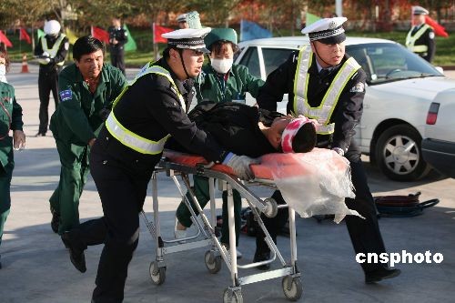 圖為演習(xí)中交警和120急救人員現(xiàn)場(chǎng)急救“傷者”。