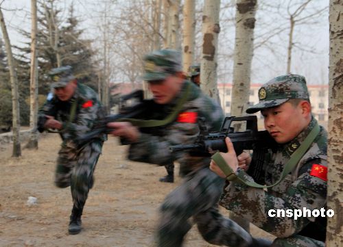 1月7日,濟南軍區(qū)第二批赴蘇丹達爾富爾維和工程兵大隊警衛(wèi)中隊的官兵進行出國前最后階段的防衛(wèi)訓(xùn)練。中新社發(fā) 畢華明 攝