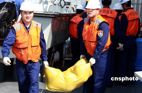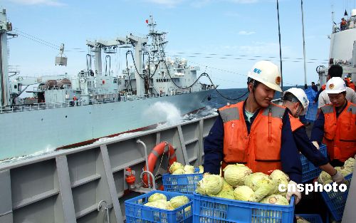 春節(jié)前夕,中國海軍艦艇編隊“海口”號導(dǎo)彈驅(qū)逐艦與“微山湖”號綜合補(bǔ)給艦完成一次海上補(bǔ)給,圖為“?凇迸灩俦徇\(yùn)補(bǔ)給到艦上的“年貨”。中新社發(fā) 孫自法 攝