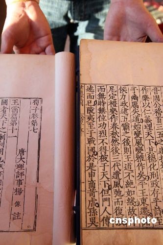 北京地壇秋季書市十一月上旬正在火爆進(jìn)行中,今年亮點之一的舊書淘寶一條街,成為許多酷愛古舊圖書的“書蟲”光顧最多的去處。圖為價值十余萬的明嘉靖世德堂刻印——《荀子二十卷》亮相北京秋季書市。中新社發(fā) 任海霞 攝