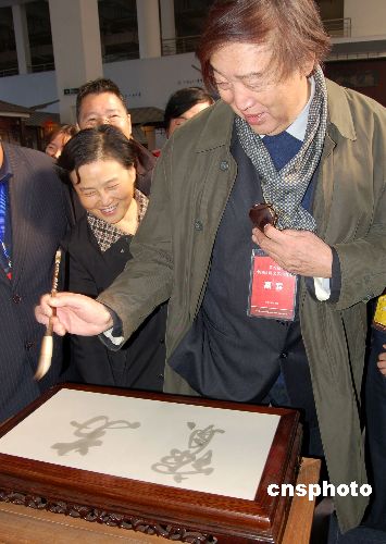 第八屆中國(guó)民間文藝山花獎(jiǎng)?lì)C獎(jiǎng)典禮于11月29日在蘇州市陽(yáng)澄湖畔相城區(qū)舉行,相城區(qū)也成為山花獎(jiǎng)永久評(píng)獎(jiǎng)基地。具有深厚歷史文化底蘊(yùn)、以民間文藝“相城十絕”著稱的相城區(qū),還將被中國(guó)民間文藝家協(xié)會(huì)授予“中國(guó)民間藝術(shù)之鄉(xiāng)”榮譽(yù)稱號(hào)。圖為中國(guó)文聯(lián)副主席、中國(guó)民間文藝家協(xié)會(huì)主席馮驥才,用“相城十絕”之一的蘇州御窯金磚現(xiàn)場(chǎng)寫字。中新社發(fā) 邱勇 攝