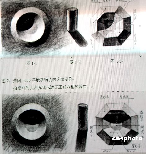 | 2007年12月6日,海南在京的一位畫家從光學(xué)角度找到中美兩“月亮”鮮明差別。中國(guó)嫦娥首幅月球圖像抄襲美國(guó)的傳言,在網(wǎng)上一度鬧得沸沸揚(yáng)揚(yáng),海南省畫家、超常創(chuàng)意專家于廣勝在北京,反復(fù)對(duì)照中美兩圖琢磨研究,從光學(xué)角度發(fā)現(xiàn)兩幅圖象有著“更加鮮明的差別”,6日早晨他發(fā)現(xiàn)兩幅圖像是在不同的光源下拍攝的,從另一側(cè)面有力證明了我國(guó)嫦娥傳回圖像的真實(shí)性。于廣勝說,這一證據(jù)是普通大眾不易發(fā)現(xiàn)的,但通過他所手繪的幾幅圖,即可讓普通大眾一目了然。同時(shí),凡是對(duì)光學(xué)有所研究或通曉繪畫用光、攝影和攝像用光的人們,自然明白其理。為了便于廣大讀者理解,他把地球上的環(huán)形山簡(jiǎn)化為內(nèi)凹外凸的圓臺(tái)(圖1-1、2-1),以顯現(xiàn)不同光線來源下的不同光影效果;由此,又進(jìn)一步簡(jiǎn)化為內(nèi)凹外凸八棱臺(tái)(圖1-3、2-3)并標(biāo)注了光線的來源和受光、測(cè)光、背光區(qū)域;同時(shí),又畫了一個(gè)圓柱體(1-2、2-2)以顯現(xiàn)不同光照角度下的不同投影方向。通過兩組手繪圖,中國(guó)與美國(guó)公布的兩張圖像在拍攝時(shí),太陽光照射月球角度明顯不同,至少左右相差42度左右。中國(guó)拍攝時(shí)的太陽光線來源于左前方,而美國(guó)拍攝時(shí)的太陽光線來源于正前方稍微偏右。于廣勝說,稍有電腦平面制作、攝影和攝像后期制作知識(shí)的人們都明白,圖片與圖片的任意組合拼接是輕而易舉的,但要想把圖片中各個(gè)圖像所有細(xì)節(jié)的光影全部改變是不可能的,“由此可見,我國(guó)嫦娥傳回的圖像其真實(shí)性是不容質(zhì)疑了。”相關(guān)鏈接:12月2日,中國(guó)探月工程首席科學(xué)家、中國(guó)科學(xué)院院士歐陽自遠(yuǎn)做客上!拔膮R講堂”,對(duì)關(guān)于“嫦娥首幅月球圖像抄襲美國(guó)”的傳言作出澄清:“嫦娥傳回的圖像確實(shí)是真實(shí)的,是經(jīng)過非常復(fù)雜的拍攝、傳輸、接收、處理過程后得到的,并且與美國(guó)所拍的圖像有細(xì)微差別”。我國(guó)嫦娥一號(hào)衛(wèi)星所攝的月面圖像上,某個(gè)地方有兩個(gè)小坑,而美國(guó)2005年最新確認(rèn)的月面圖像上,同樣的地方只有一個(gè)小坑。中新社發(fā) 善平 攝