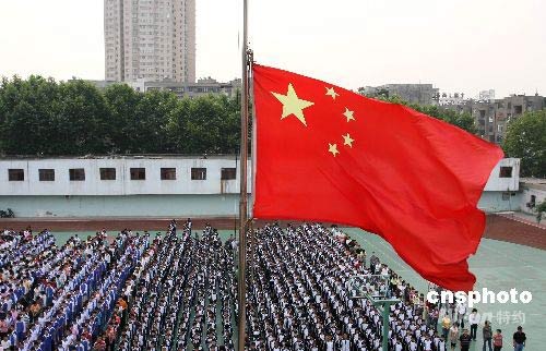 5月19日清晨,湖北襄樊31中降半旗,哀悼“5·12”汶川大地震中的遇難同胞。中新社發(fā) 余翔 攝
