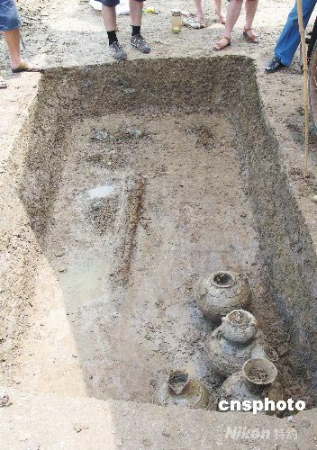 2008年7月24日,蘇州博物館考古工作者對(duì)蘇州相城區(qū)古宮黃泥村的一座西漢古墓進(jìn)行發(fā)掘,該古墓出土了一批墓葬品,共有3組6件,包括青銅鏡、陶壺、陶瓿和陶罐以及釉陶,都是兩個(gè)一對(duì)的組合,不僅器形較大,釉色更好,而且保存完好。據(jù)了解,該墓葬長3.15米,寬1.60米,被確定為西漢時(shí)期,墓葬規(guī)模以及隨葬品都超過以往發(fā)現(xiàn)的同年代墓葬,具有一定的價(jià)值。中新社發(fā) 朱子寒 攝