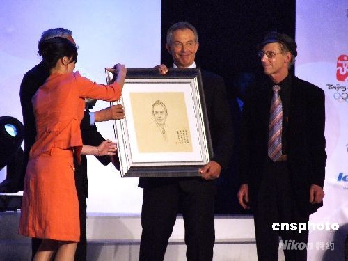 8月4日,由北京大學(xué)主辦的“2008奧運.冠軍論壇”在北京大學(xué)百年紀念講堂內(nèi)隆重開幕。出席開幕盛典的貴賓有英國前首相托尼.布萊爾、成龍、譚盾、揚揚、羅雪娟在內(nèi)的數(shù)十位中外嘉賓。圖為北京大學(xué)校長許智宏向英國前首相托尼.布萊爾贈送畫像。中新社發(fā) 鄭雄增 攝