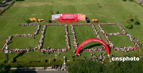 比賽現(xiàn)場對(duì)陣的棋桌組成巨大的“2008”字樣,場面壯觀。