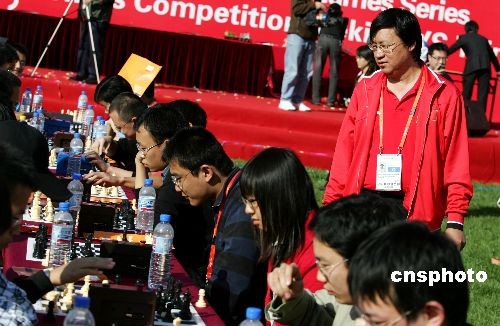 10月11日,第四屆“aigo杯”清華、北大愛國者象棋交流賽,在北京五洲大酒店舉行,來自清華、北大的800名學(xué)子展開一場激烈角逐,為觀眾奉獻(xiàn)一場宏偉壯觀的象棋對(duì)弈賽。作為第一屆智運(yùn)會(huì)的系列活動(dòng)之一,交流賽得到國際智力聯(lián)盟、智運(yùn)會(huì)組委會(huì)和國家體育總局的支持。比賽現(xiàn)場對(duì)陣的棋桌組成巨大的“2008”字樣,場面壯觀。中新社發(fā) 富田 攝