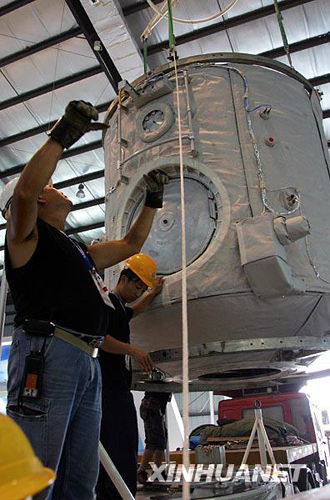 10月30日,工作人員將“神七”軌道艙吊裝到展臺上。新華社發(fā) 李建束 攝