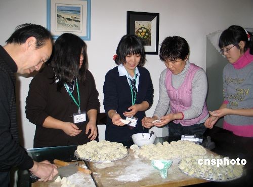 十二月二十一日,適逢中國農歷傳統(tǒng)節(jié)日冬至,日本青少年友好使者代表團一百名成員抵達西安,與當地中學生進行“民宿對接活動”。圖為陜西師范大學附中高一年級學生楊肖影(右一)一家,與日本學生市井亞子和寺本編繪在學習體驗包餃子。中新社發(fā) 冽瑋 攝