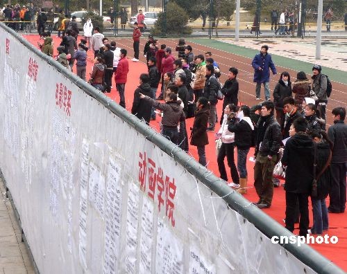 2009年2月17日下午,北京電影學(xué)院三試榜單“出爐”,541名考生入圍表演學(xué)院的最終考試。之前進入復(fù)試的1500余名考生及家長紛紛前來看榜,七成復(fù)試考生被淘汰。中新社發(fā) 玉龍 攝