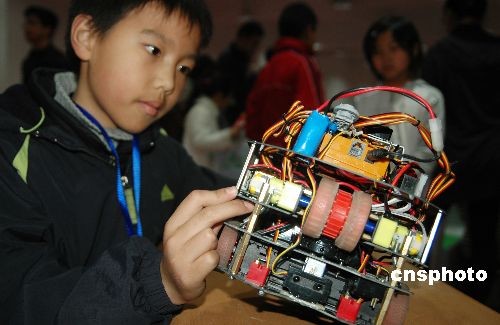2009年3月29日,2009年“VEX”杯蘇州市青少年機(jī)器人比賽在蘇州善耕實(shí)驗(yàn)小學(xué)開幕,來(lái)自蘇州敬文實(shí)驗(yàn)小學(xué)及其周邊縣市的77所中小學(xué)校的467位選手參賽,參賽者分別進(jìn)行了機(jī)器人“踢足球”、“滅火”和“基本技能”等八個(gè)項(xiàng)目的角逐,場(chǎng)面十分熱鬧。中新社發(fā) 蘇民 攝