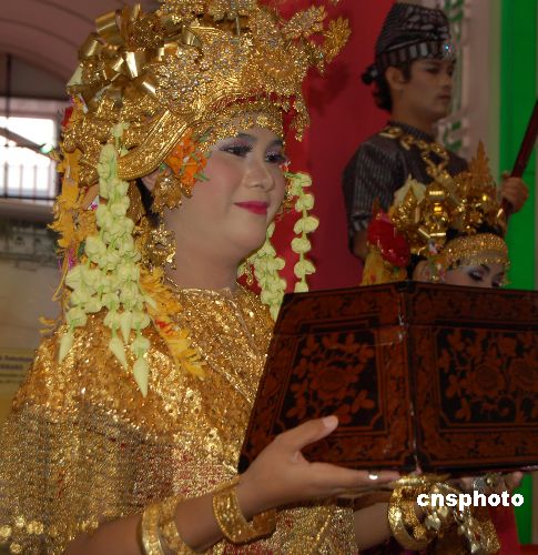 圖為身著民族盛裝的印尼藝人在展示印尼風情。