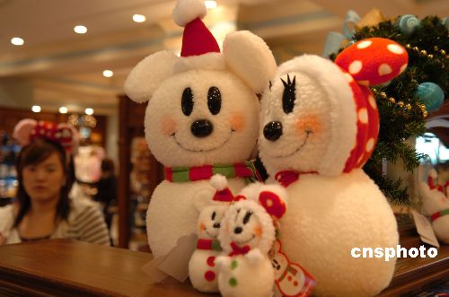 圖為東京迪斯尼樂(lè)園中的特色禮物商店中的圣誕吉祥物“雪人一家”。