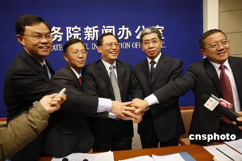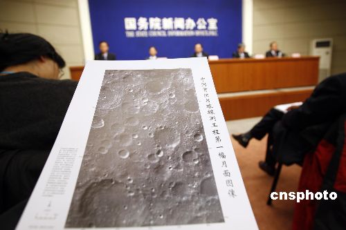 11月26日下午,繞月探測工程領(lǐng)導(dǎo)小組副組長、國防科工委副主任、航天局局長孫來燕(中),繞月探測工程測控系統(tǒng)副總指揮、北京航天飛行控制中心主任朱民才(左二),繞月探測工程副總指揮、航天科技集團(tuán)公司副總經(jīng)理雷凡培(右二),中國科學(xué)院空間科學(xué)與應(yīng)用中心主任吳季(右)以及國新辦新聞局副局長華清(左),在國務(wù)院新聞辦公室舉行的新聞發(fā)布會(huì)上,共同慶祝中國首次月球探測工程的圓滿成功。當(dāng)日,國務(wù)院新聞辦公室邀請(qǐng)中國繞月探測工程領(lǐng)導(dǎo)小組副組長、國防科工委副主任、國家航天局局長孫來燕等介紹中國首次月球探測工程等方面情況,并答記者問。中新社發(fā) 杜洋 攝