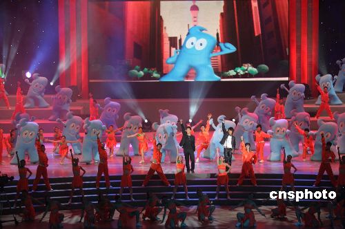 十二月十八日晚,備受海內(nèi)外矚目的中國二0一0年上海世博會吉祥物在上海大舞臺揭開神秘面紗。一個返璞歸真的、漢字“人”的藍(lán)色卡通造型——吉祥物“海寶”正式亮相。“海寶”吉祥物的誕生,是海峽兩岸設(shè)計師共同的智慧結(jié)晶。其最初使用漢字充當(dāng)吉祥物的創(chuàng)意始于臺灣知名設(shè)計師巫永堅,他的應(yīng)征作品漢字卡通形象“大寶”在全球兩萬六千多件應(yīng)征作品中脫穎而出,再經(jīng)過上海設(shè)計名家邵隆圖及其團隊的整合、再設(shè)計,“海寶”最終定型。中新社發(fā) 潘索菲 海牛 攝