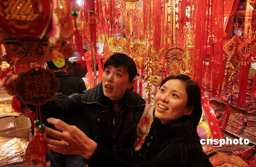 十二月三十一日,為了迎接新年,福建泉州購買喜慶用品的市民絡(luò)繹不絕,市場熱鬧非凡!氨瘛睊旒、彩燈、“中國結(jié)”等的銷售異;鸨,家家戶戶都將自家里里外外裝點(diǎn)一新迎接新年。中新社發(fā) 傅丹丹 攝