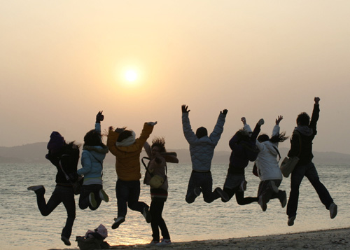 臺灣地區(qū)2007年最后一道夕陽,十二月三十一日出現(xiàn)在金門,古寧頭慈堤外,青年追日族興奮揮別落霞,準備迎接新一年到來。(“中央社”圖;倪國炎攝)