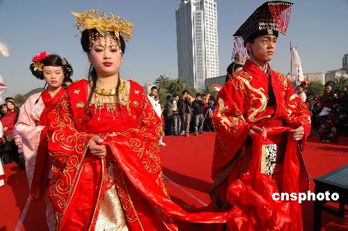 12月31日,臺(tái)州市民廣場(chǎng)傳統(tǒng)婚俗表演。當(dāng)日,浙江臺(tái)州市一家婚慶公司在臺(tái)州市民廣場(chǎng)舉辦了一場(chǎng)傳統(tǒng)的婚俗表演,向元旦假期到戶(hù)外游玩的市民展示中國(guó)古代傳統(tǒng)婚俗文化,吸引了眾多市民觀看。中新社發(fā) 朱孝欽 攝