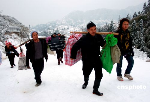近一個(gè)月來(lái),廣西融水縣遭受當(dāng)?shù)亟?7年來(lái)最嚴(yán)重的雨雪冰凍災(zāi)害,在海拔1470米的摩天嶺,冰雪封凍導(dǎo)致交通中斷,當(dāng)?shù)刂泄颤h員每天為過往災(zāi)民義務(wù)帶路和挑擔(dān),幫助他們翻越冰雪覆蓋的摩天嶺,安全回家。中新社發(fā) 張耀華 攝