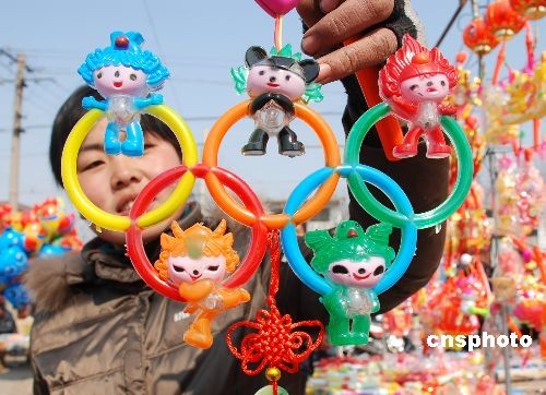 元宵節(jié)臨近,2月15日,在山東棗莊山亭區(qū)農村大集上,與奧運主題相關的居室飾品、時尚花燈等商品備受人們青睞,“奧運經濟”格外火爆。中新社發(fā) 劉明祥 攝