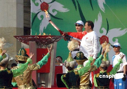 4月2日,北京奧運會的火炬?zhèn)鬟f于中午12時從阿拉木圖麥迪奧山大壩出發(fā),五個小時后在阿斯塔納廣場舉行慶典活動。這是奧運圣火首次來到哈薩克斯坦,當(dāng)?shù)貙κセ饌鬟f相當(dāng)重視。圖為當(dāng)天最后一位火炬手、2000年奧運會拳擊冠軍葉爾馬罕·伊布拉莫夫用手中的火炬點燃圣火盤。這預(yù)示著北京奧運圣火境外傳遞首站火炬?zhèn)鬟f落幕。 中新社發(fā) 沈晨 攝