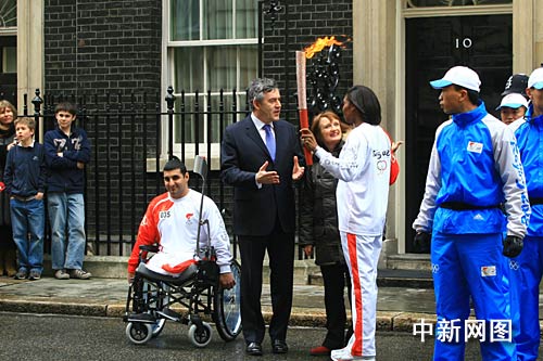 快訊:英國首相布朗在唐寧街歡迎北京奧運(yùn)圣火(圖)
