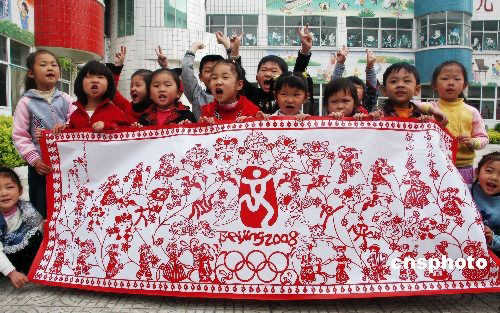 4月7日,幼兒園的小朋友在參觀《華夏兒女喜迎奧運(yùn)圣火》剪紙作品。近日,河南周口軍分區(qū)幼兒園老師陳雪英用兩周的時(shí)間加班制作出了一幅《華夏兒女喜迎奧運(yùn)圣火》的剪紙作品。據(jù)了解,該作品邊長2.3米,寬0.75米,畫面上刻有福娃、五環(huán)、火炬、和平鴿和各民族娃娃,整幅作品用國花牡丹連接而成,四周是一百多個(gè)火炬,象征著奧運(yùn)圣火在全世界巡回傳遞,整幅作品表達(dá)了華夏各族兒女喜迎奧運(yùn)圣火的歡樂情景。中新社發(fā) 楊正華 攝