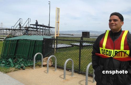 當(dāng)?shù)貢r(shí)間四月八日,一名保安人員在舊金山中國(guó)灣公園執(zhí)勤。北京奧運(yùn)火炬舊金山站傳遞活動(dòng)開幕儀式九日將在這里舉行,開幕式所用舞臺(tái)基本搭建完成。作者: 張煒