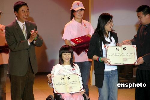 四月十日,中國首枚冬奧會金牌獲得者揚(yáng)揚(yáng)、前體操運(yùn)動員桑蘭和中國相聲名家馮鞏被聘為北京奧運(yùn)會、殘奧會文明觀眾、拉拉隊(duì)隊(duì)長。圖右為楊揚(yáng)從北京奧組委志愿者部部長劉劍手中接過聘書。作者: 沈嘉