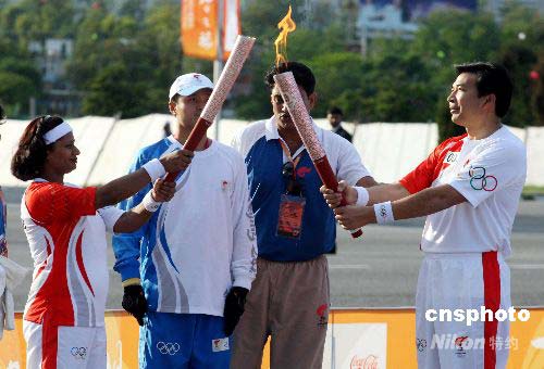 4月16日下午5時(shí),巴基斯坦曲棍球隊(duì)前隊(duì)長(zhǎng)義夫拉·汗從巴基斯坦總統(tǒng)穆沙拉夫和總理吉拉尼兩人手中接過第一棒“祥云”火炬,北京奧運(yùn)圣火開始在巴基斯坦首都伊斯蘭堡傳遞。圖為中國(guó)駐巴基斯坦大使羅照輝(右)與第三棒火炬手交接。作者: 沈晨